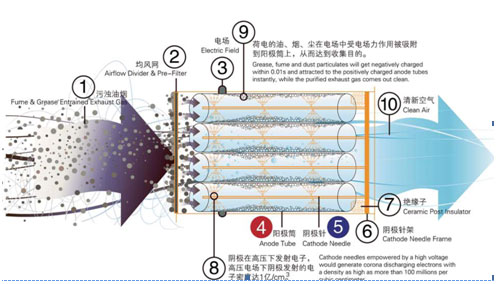 電場的設(shè)計使廢氣粒子的運動速度較低,一般在零點幾秒內(nèi)便能使廢氣粒子荷上足夠的電荷,帶電粒子在電場中會受到電場力(庫侖力)的作用,其結(jié)果是油煙粒子被吸附到陽極上。因此凈化率非常高,而且特別適用于捕捉粒徑較小和重量較輕的廢氣粒子。